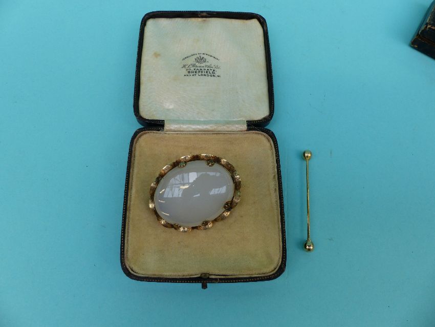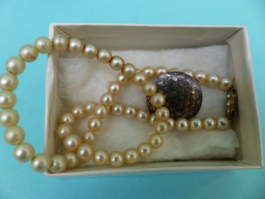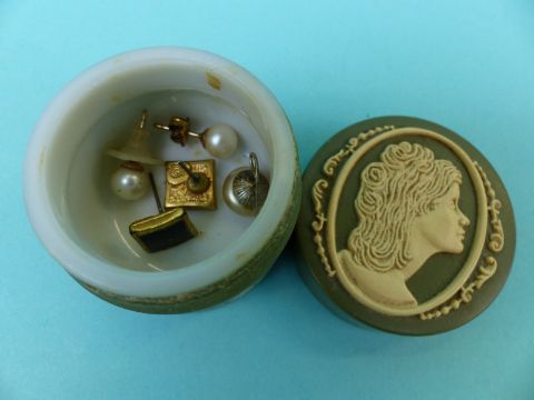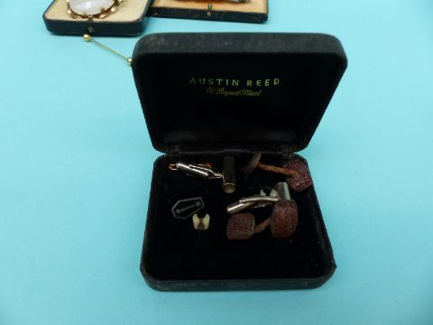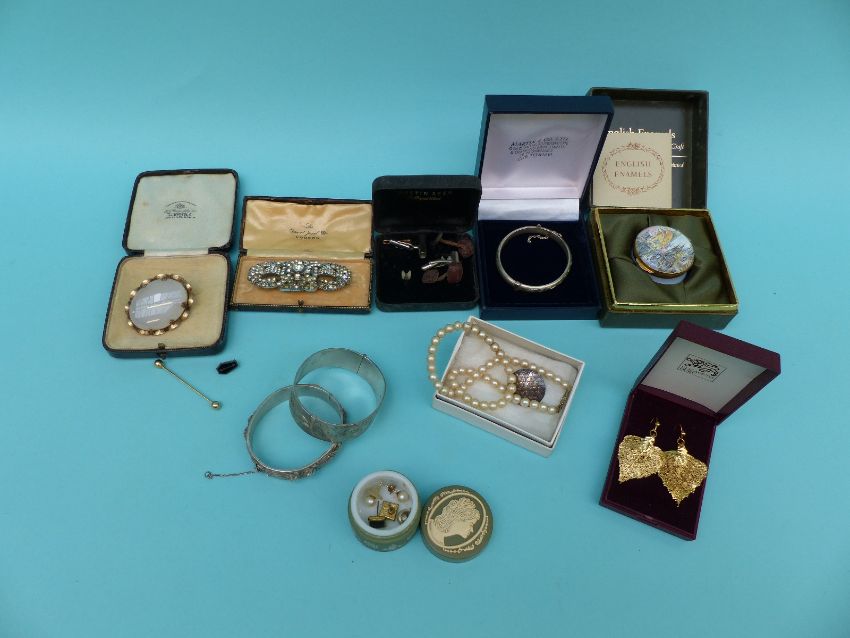 Two hallmarked silver bangles, a Victorian brooch, an enamel pot, silver gilt earrings, paste brooch, cufflinks, faux pearl necklace etc