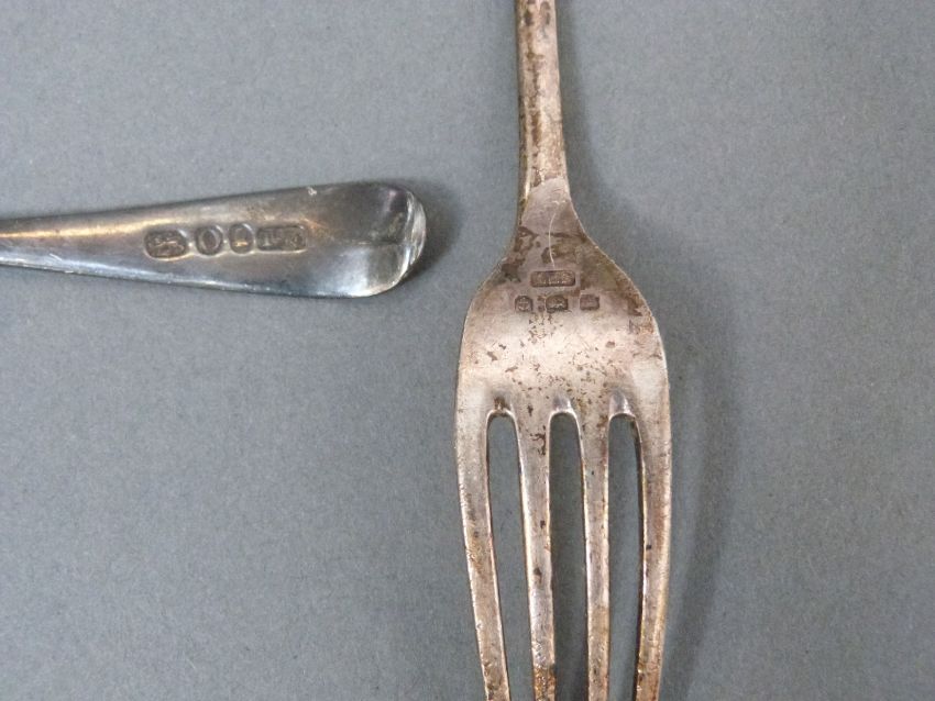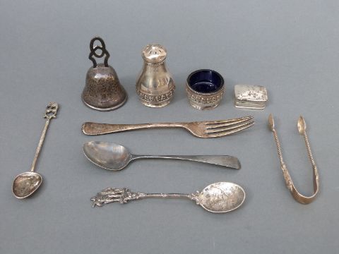 A quantity of hallmarked silver and white metal items including cutlery, hammered bell, salt, pepper, small box etc, weight 168g