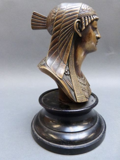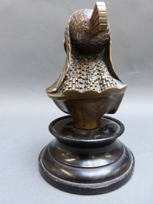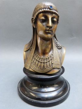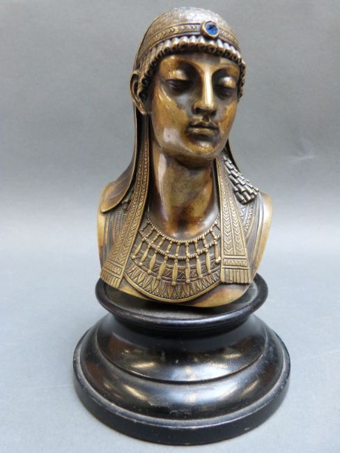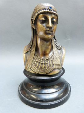 A 19thC cast bronze Egyptian revival bust with sapphire style headband, height 17cm