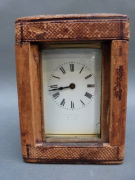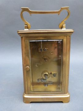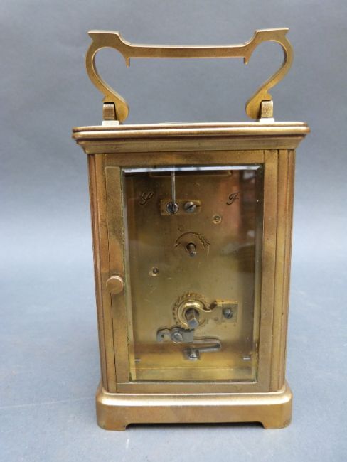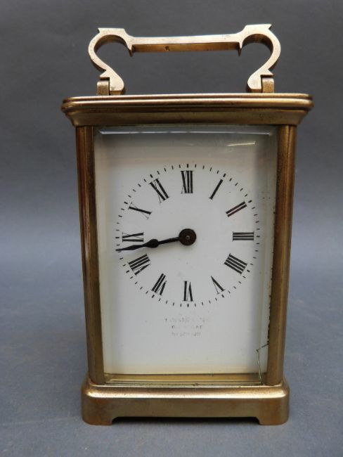 Lawson & Son, Brighton, brass corniche style carriage clock, enamelled Roman dial and blued steel hands, complete with carrying case, 12cm tall