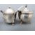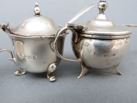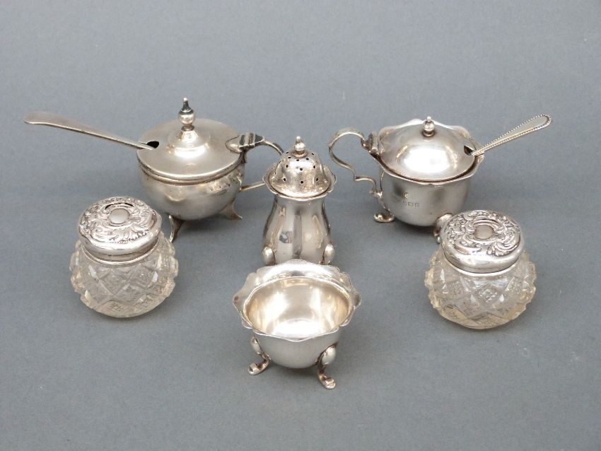 A hallmarked silver three piece cruet set, further lidded mustard with blue glass liner, two cut glass hallmarked silver pots and two plated mustard spoons