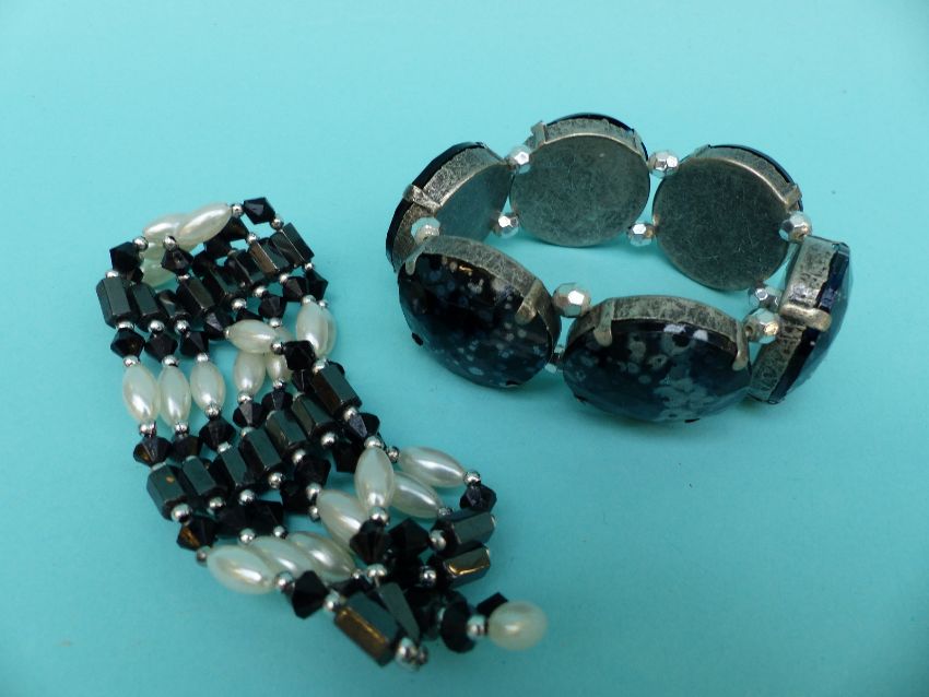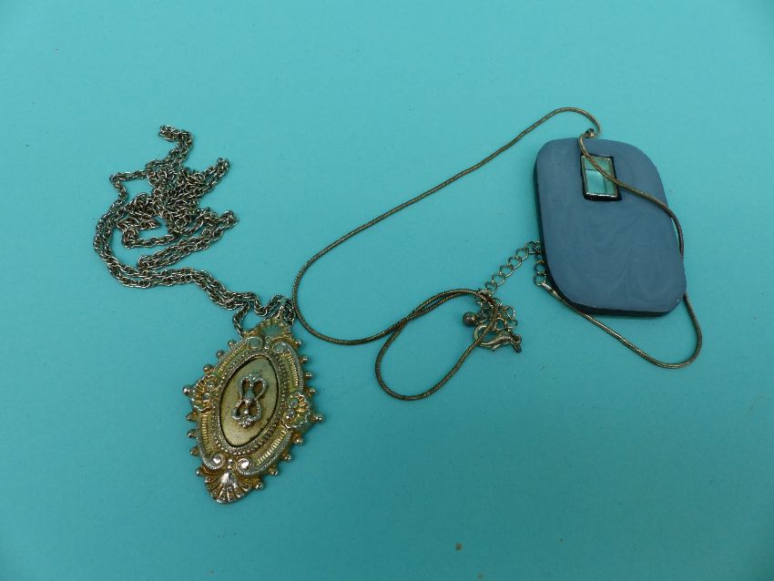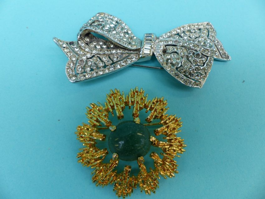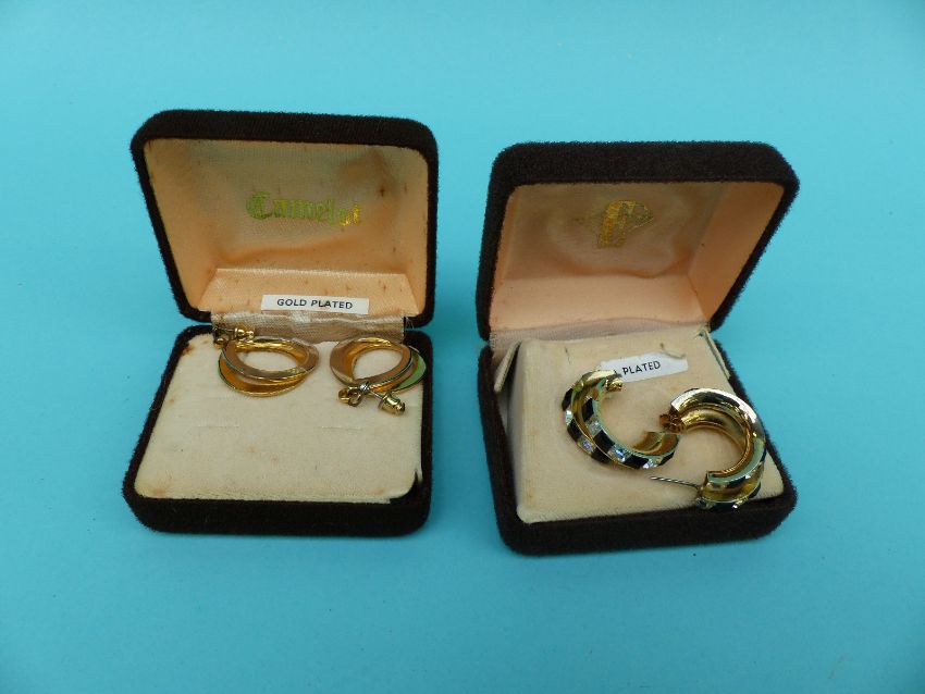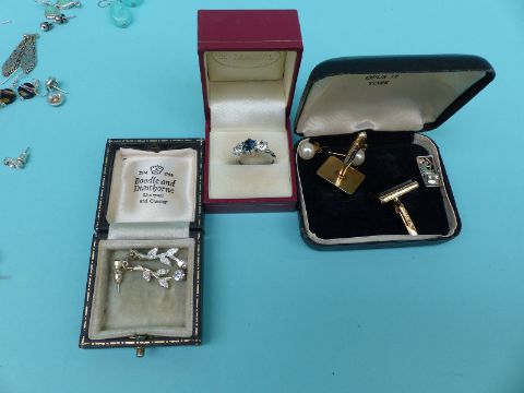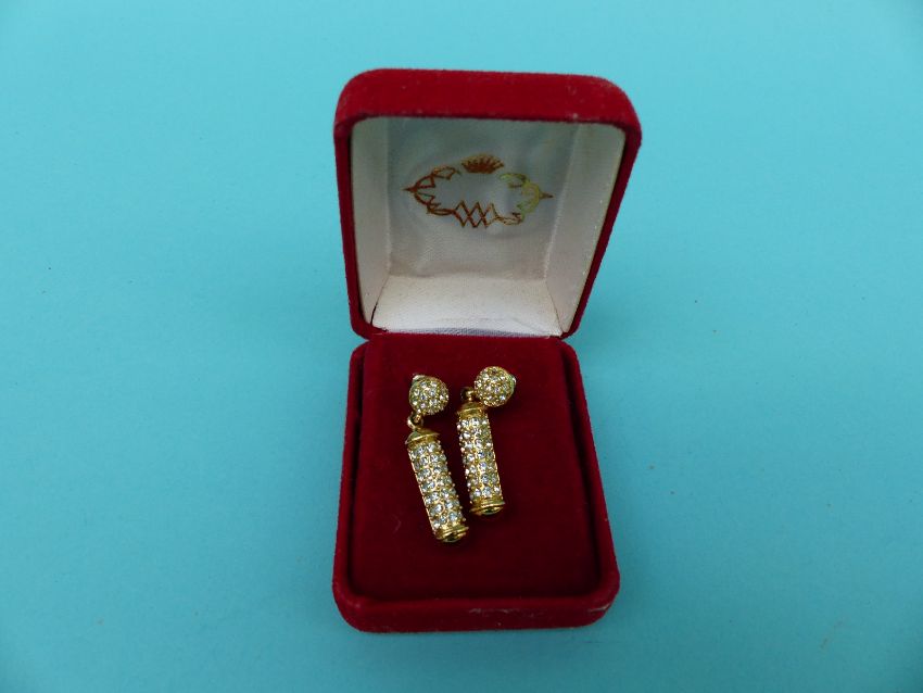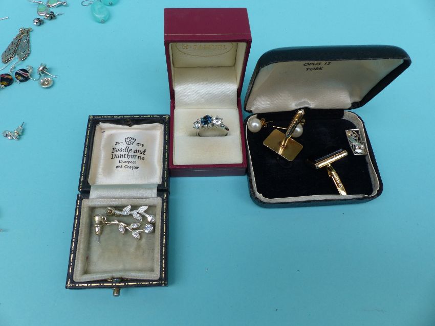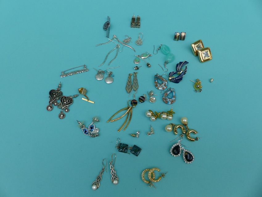 A collection of costume jewellery to include Butler and Wilson earrings, large quantity of silver earrings, silver watch, paste brooch, carved box etc