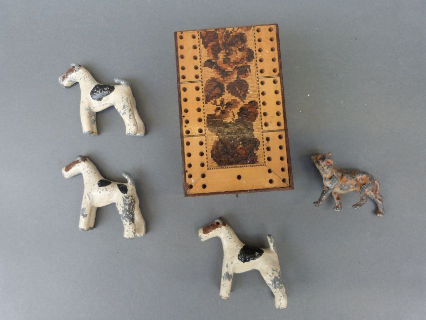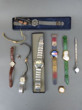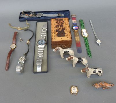A collection of various ladies and gentleman's wristwatches including Swatch, Tommy Hilfiger, etc together with an inlaid cribbage board, lead animals etc.