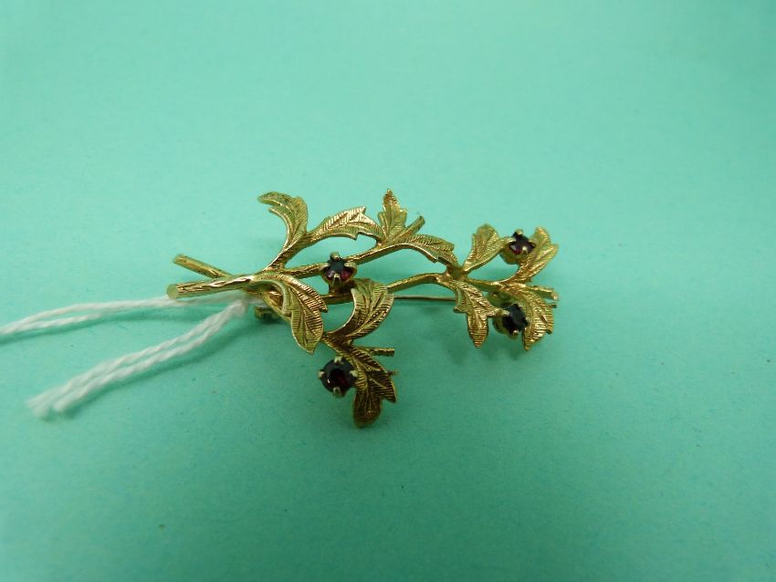 A 9ct gold brooch in a foliate design set with garnets, 5.5g