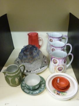 A Wedgwood Jasperware cup and saucer, another 19thC cup and saucer with relief moulded decoration, Bristol Pottery baby's plate, Cranberry glass jug, Homemaker plate etc