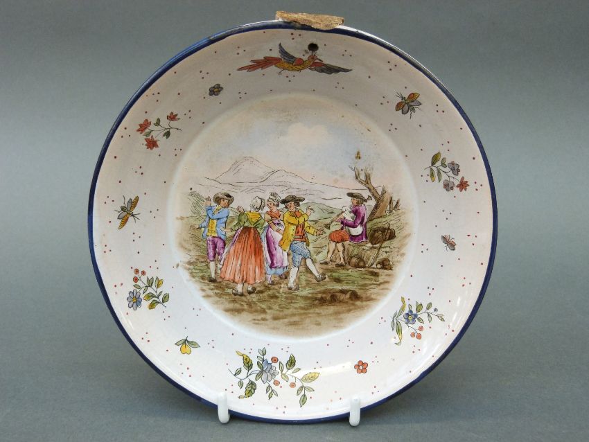 A 19thC tin glazed dish with hand decorated scene of dancers and musician in rural setting