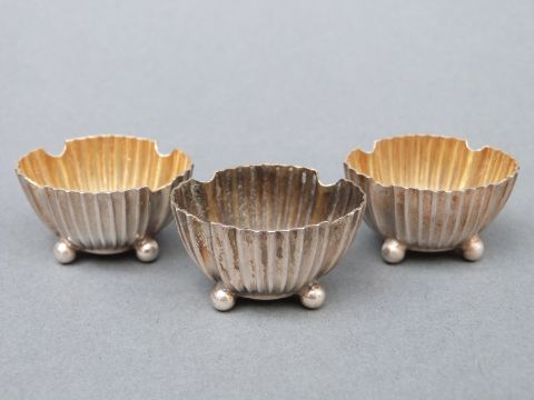 Three Victorian hallmarked silver open salts with ribbed bodies raised on four ball feet, Sheffield 1882 and 1883, maker Atkin Brothers, length 3.75cm, weight 38g