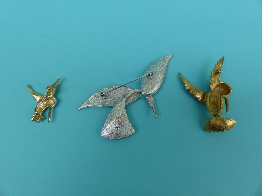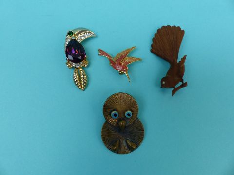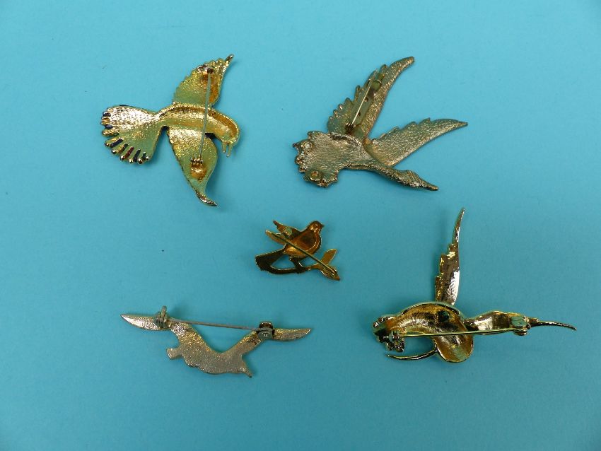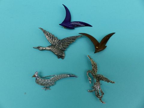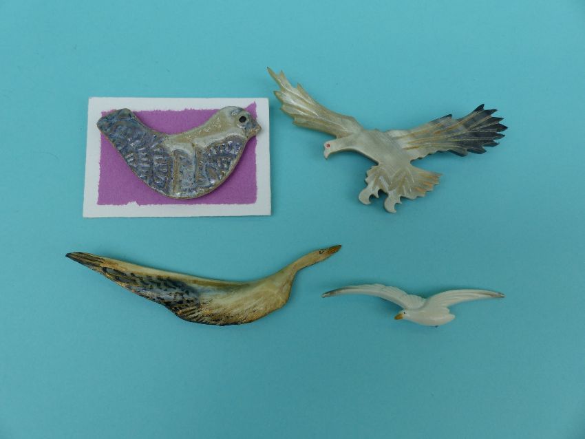 A collection of brooches depicting birds to includes enamel, bone, ceramic, metal, wood, plastic Buch and Deichmann of Denmark seagulls etc