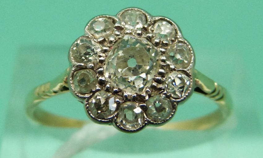 An 18ct gold Victorian ring set with an old mine cut diamond of approximately 0.45ct surrounded by old English cut diamonds (size P)