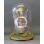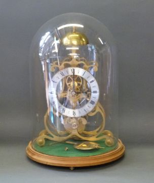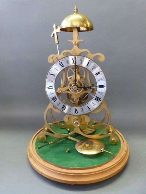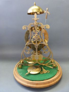 A brass skeleton timepiece with single fusee movements silvered Roman chapter ring, beetle and poker hands, the movement with lyre shaped plates, striking on a top bell with a decorative axe shaped hammer, standing on a light wood plinth raised on brass feet, under glass dome, 40cm tall