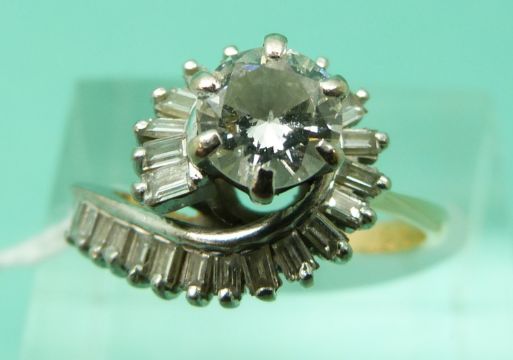 An 18ct gold ring set with a round brilliant cut diamond of approximately 0.75ct surrounded by further baguette cut diamonds (size K)