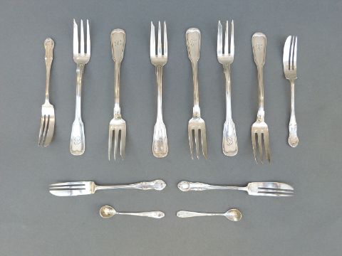 A set of six German white metal cake forks marked 800, weight 166g, four hallmarked silver cake forks, weight 70g, and two salt spoons marked 800