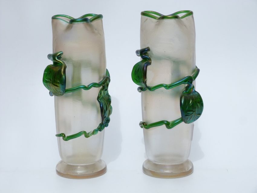 A pair of Kralic style iridescent glass vases with applied decoration and pinched necks