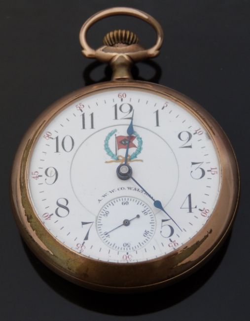 Lehigh Valley Railroad A W W Co Waltham gold plated keyless winding open faced pocket watch with LV railway flag to the white enamel dial, inset subsidiary seconds dial and blued hands, case diameter 55mm.