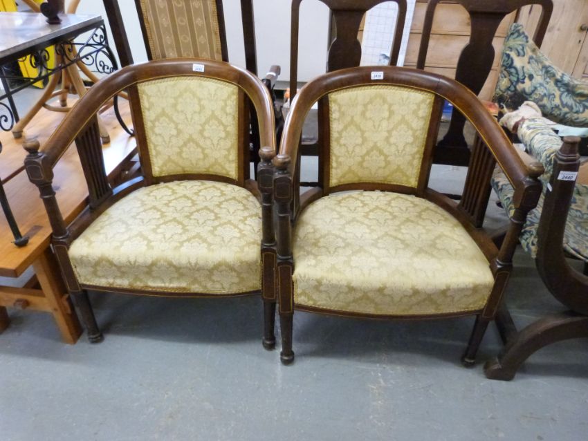 A pair of late 19thC/early20thC inlaid upholstered tub chairs