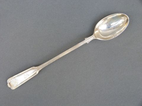 An Elizabeth II fiddle thread and shell pattern hallmarked silver long teaspoon or jam spoon, Sheffield 1957, maker Atkin Brothers, length 18.5cm, weight 44g