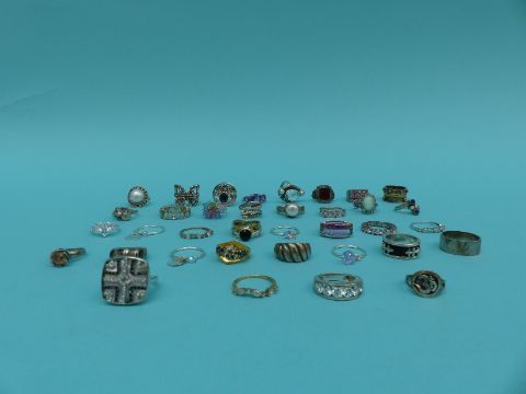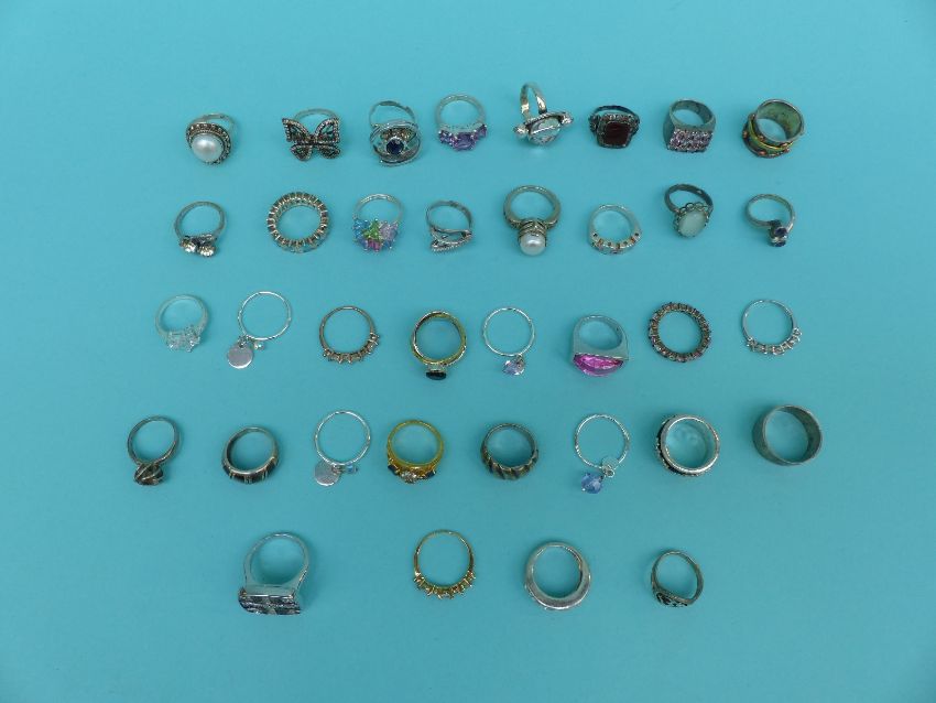 A collection of 37 silver/white metal rings including pearl, topaz, crystal etc