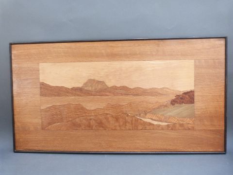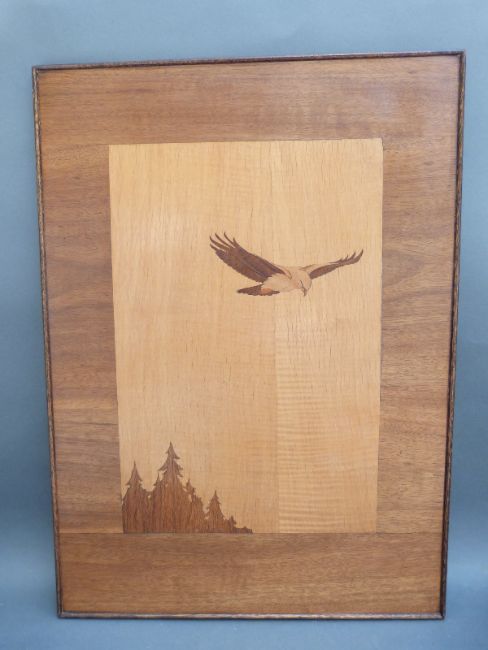Two marquetry pictures, one Loch Maree, the other a buzzard, each approximately 40 x 75cm
