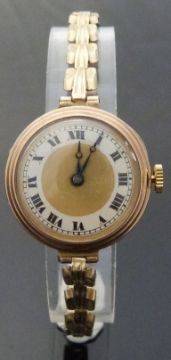 Swiss 9ct gold wristwatch with black Roman numerals, gold engine turned face and blued Breguet hands, on yellow metal Art Deco style bracelet, case diameter 25mm.