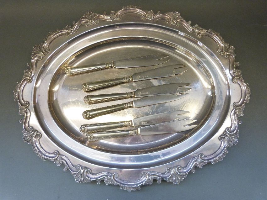 A quantity of silver plate including a wine cooler, serving dish, large tray (length 46cm) etc