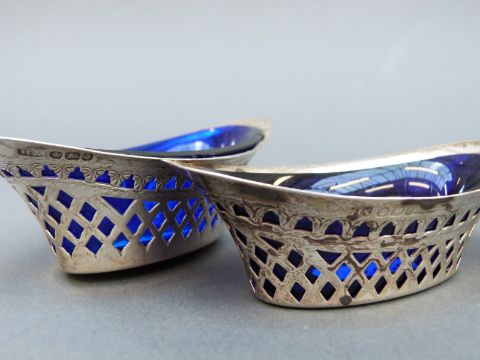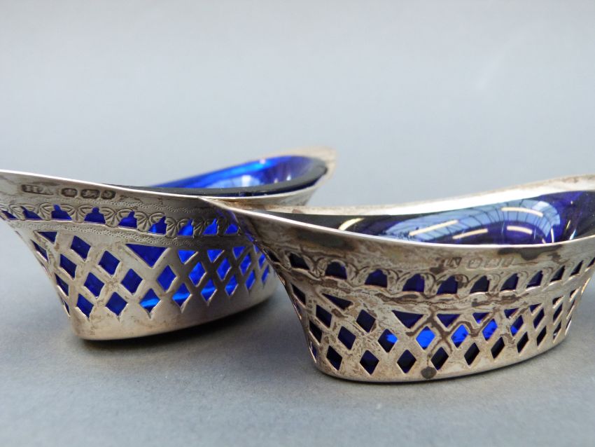 Four Victorian and later hallmarked silver basket shaped open salts with blue glass liners, Sheffield 1896, 1909 and 1911 all made by Atkin Borhers, length of longest 11.5cm other three length 10cm, weight of silver 116g