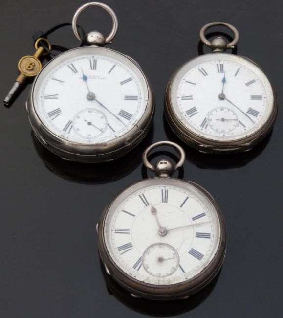 Three hallmarked silver pocket watches including Robert Reid of Bristol all with inset subsidiary seconds dials and Roman numerals.