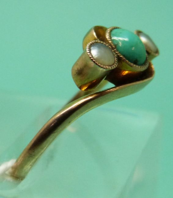 A 9ct gold ring set with a turquoise cabochon and two seed pearls (size L)