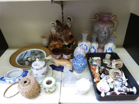 A collection of ceramics including Beswick, Pendelfin, Wade, Worcester, Staffordshire figures, Japanses Imari vase, Derby/Coalport pot pourri, continental charger etc