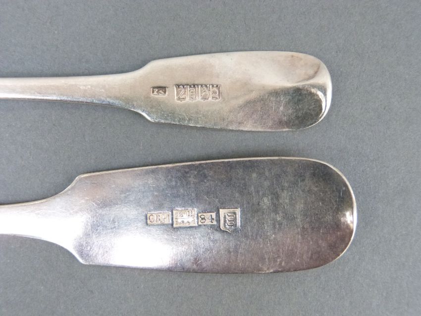 A Russian white metal fiddle pattern table spoon, length 23cm, with Russian 84 silver marks and dated 1862, with engraving to front relating to Port Kunda also dated 1862 together with a 19thC Irish hallmarked silver teaspoon, weight of both 92g