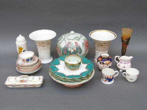 A collection of 18th & 19thC and later ceramics to include a Chinese ginger jar, Royal Crown Derby Imari vase, pair of 19thC trumpet vases, Dresden, 18thC tea ware et