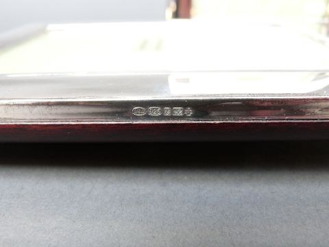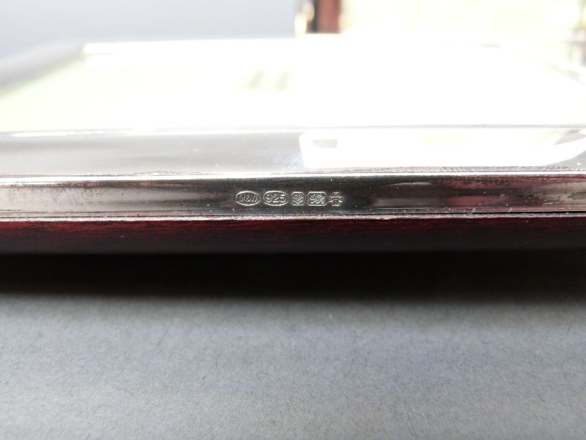 A pair of modern boxed hallmarked silver Mappin and Webb photograph frames to suit 6 x 4 inch photographs, overall size 13 x 17cm