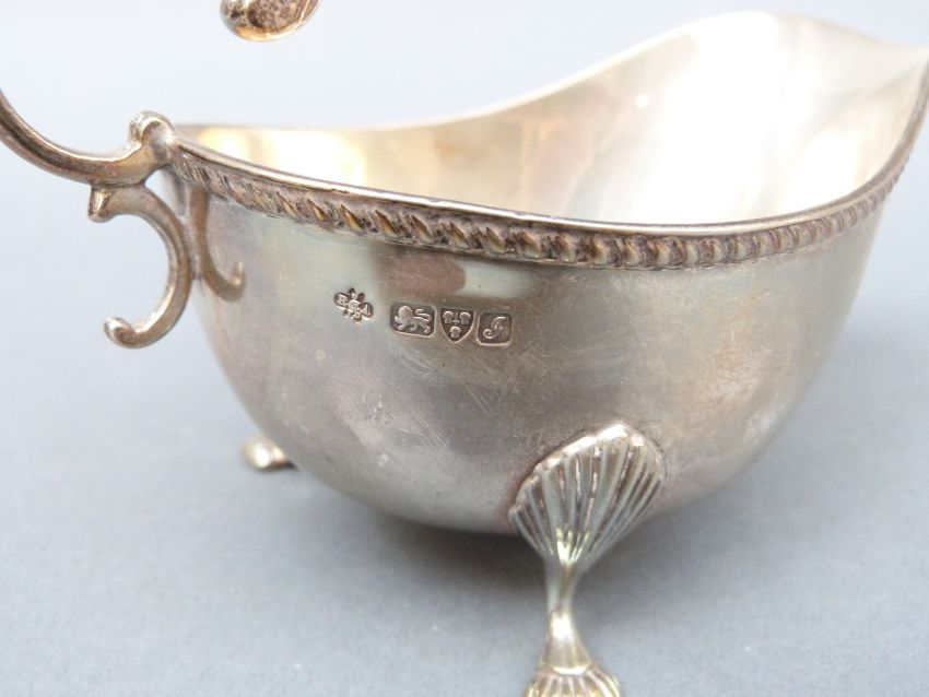 An Edward VII hallmarked silver sauce boat raised on three feet with scroll handle, Chester 1909, maker Jay, Richard Attenborough Co Ltd, length 16.5cm, weight 151g