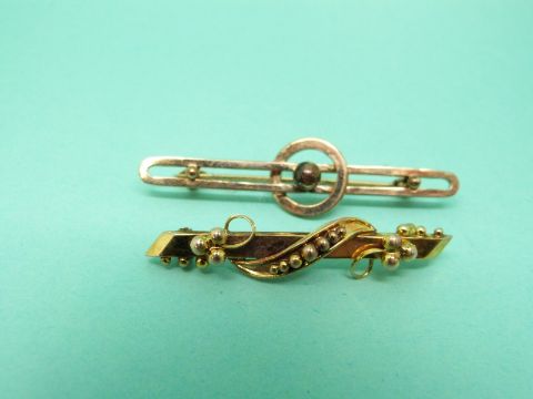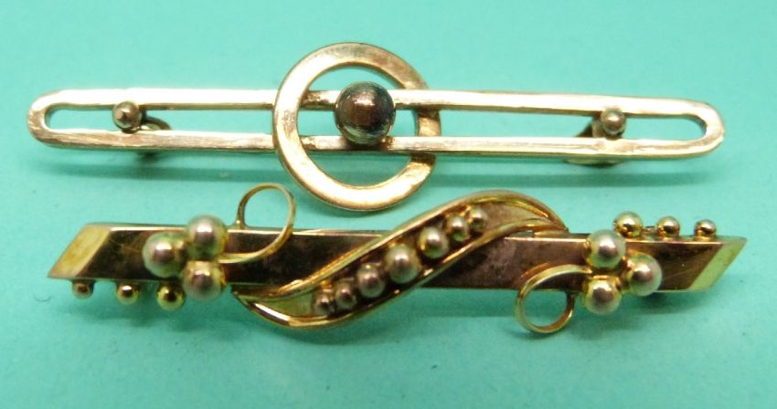 A 9ct gold brooch with sphere decoration and a yellow metal brooch