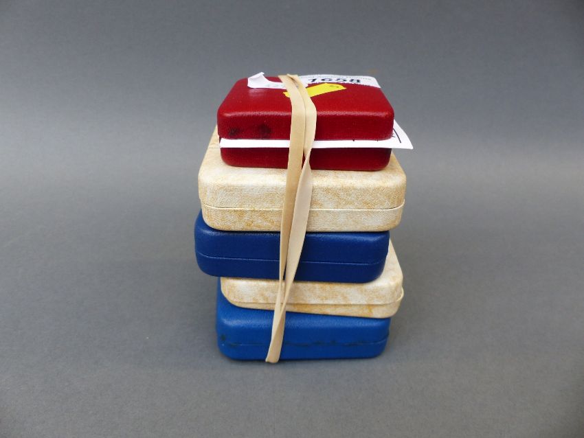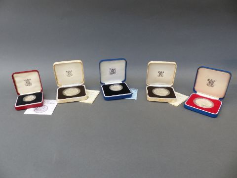 Five cased commemorative coins comprising a silver £2 Commonwealth example of 1986, a silver 1977 crown (no certificate), a UK silver 1983 £1, and two Queen Mother 80th birthday proof crowns