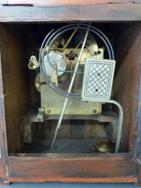 A three train Junghans mantel clock with silvered Arabic dial, striking on a gong with strike silent facility