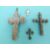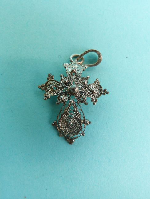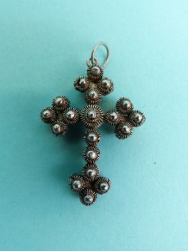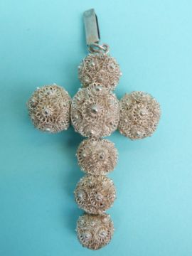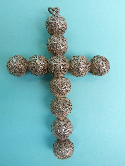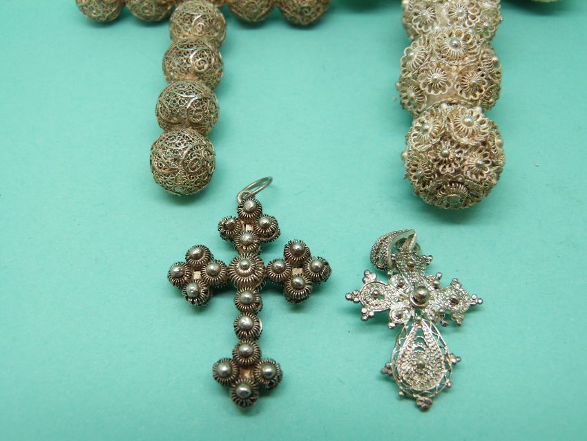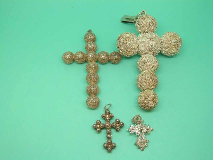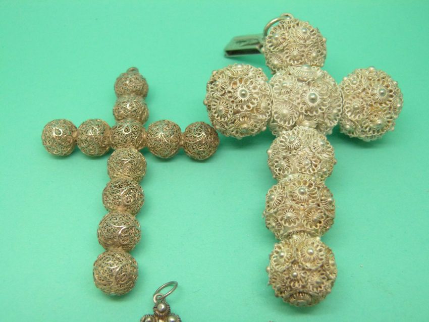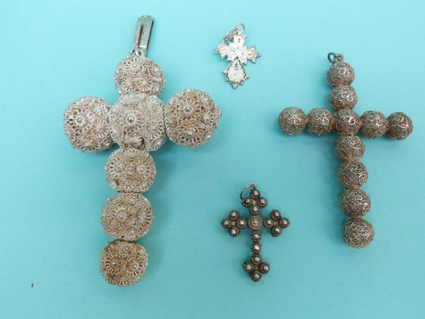 Two white metal cross pendants made up of spheres of filigree and two smaller pendants