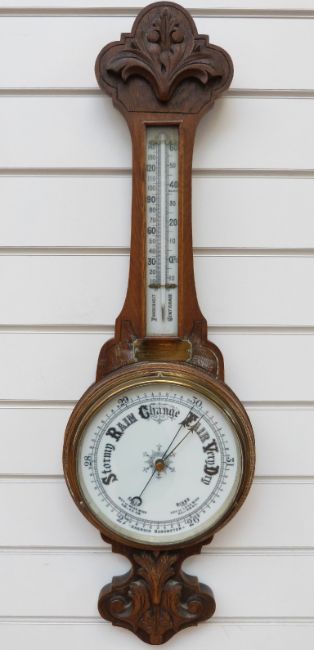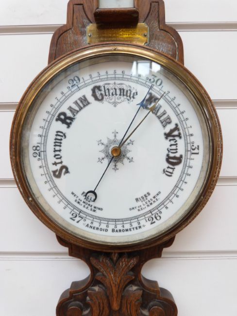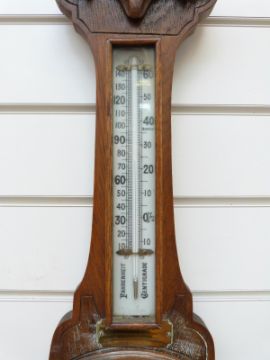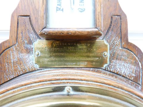 An early 20thC aneroid wall barometer and thermometer combination, in carved oak case, with brass plaque inscribed Presented to Sapper W M Lawrence by his comrades in the City of Edin (F) R.E. on the occasion of his marriage 11th June 1917