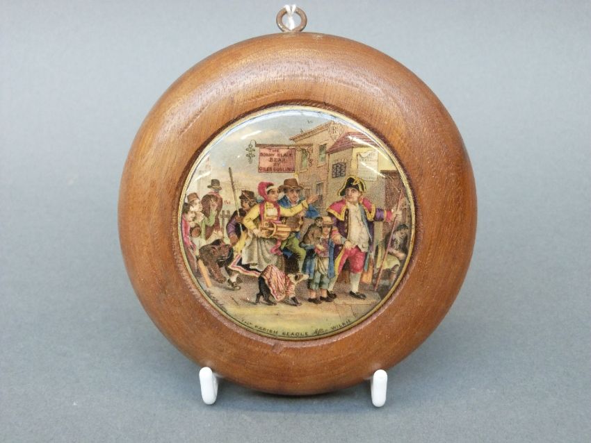 Prattware pot lid 'The Parish Beadle after Wilkie' 7.5cm in diameter, in turned wooden frame.