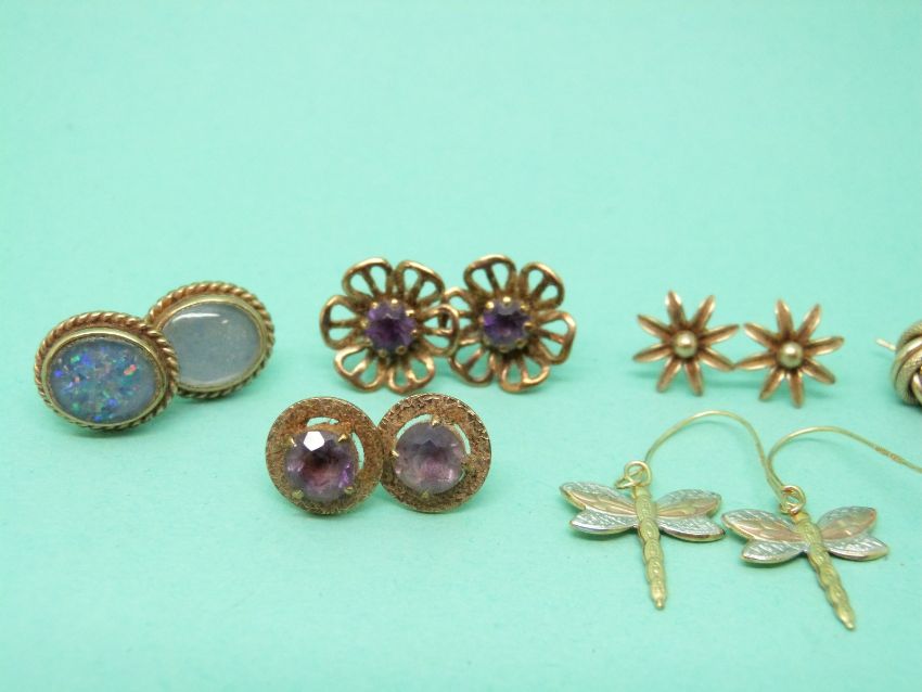 Two pairs of 9ct gold earrings set with amethysts, 9ct gold earrings set with faux opal and two 9ct gold pairs of studs etc