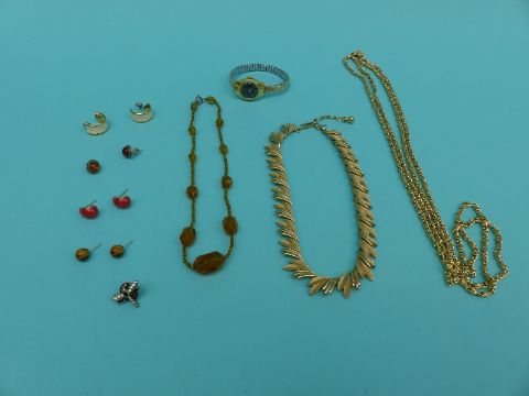 A collection of jewellery to include a beaded necklace, tiger's eye earrings, pressed amber earrings etc