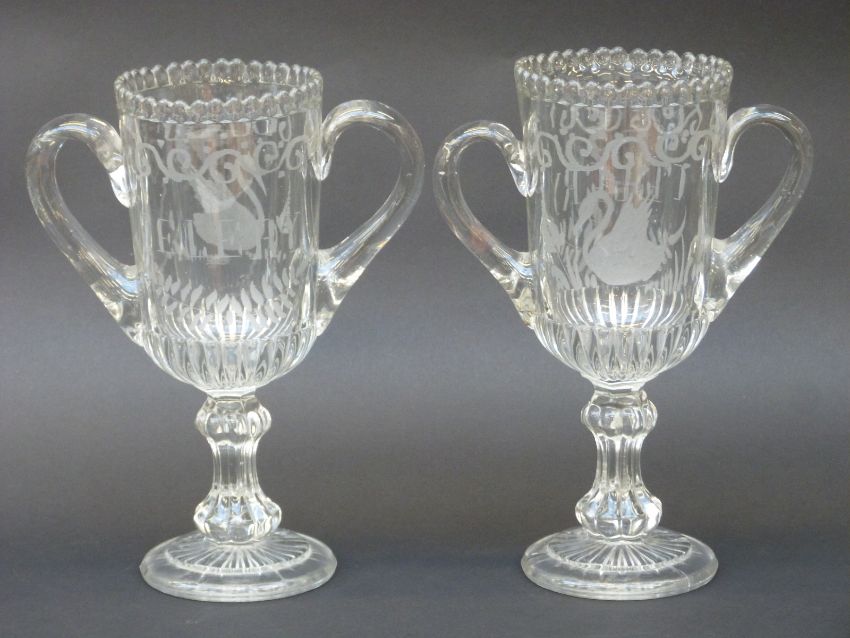 A pair of clear glass trophy/urn shaped glass celery vases with etched decoration, 26cm tall