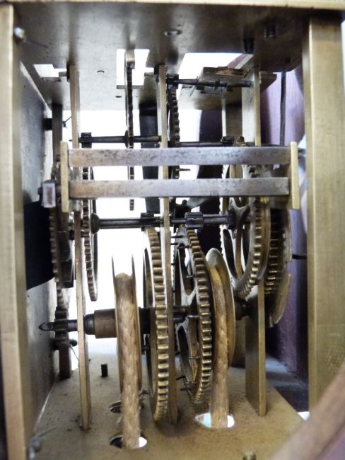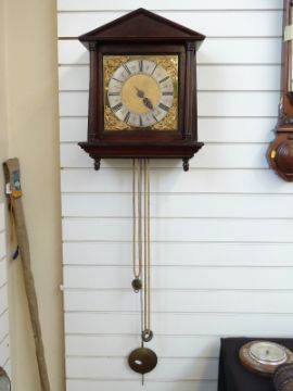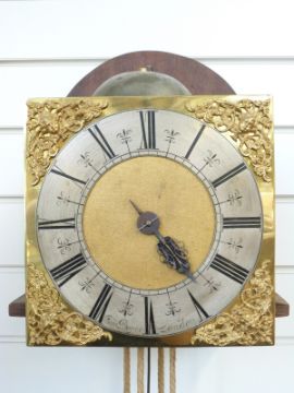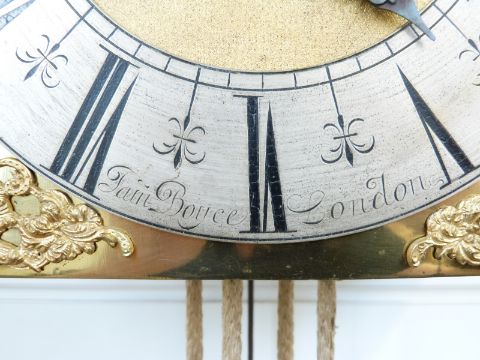 James Boyce 18thC 30 hour hooded, hour striking wall clock in mahogany case, single steel finger hand, matted brass dial with silvered Roman chapter ring inscribed Jam.Boyce, London, brass masked cherub spandrels to corners