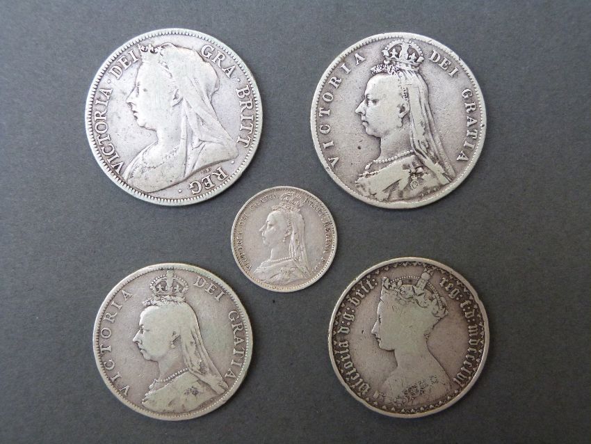 Five Victorian silver coins to include 1856 Gothic florin, 1887 sixpence, 1889 Jubilee florin and 1890 half crown with an 1898 veiled head halfcrown, all fine