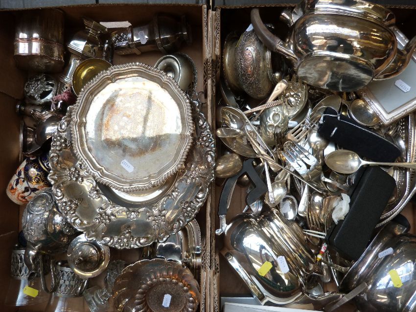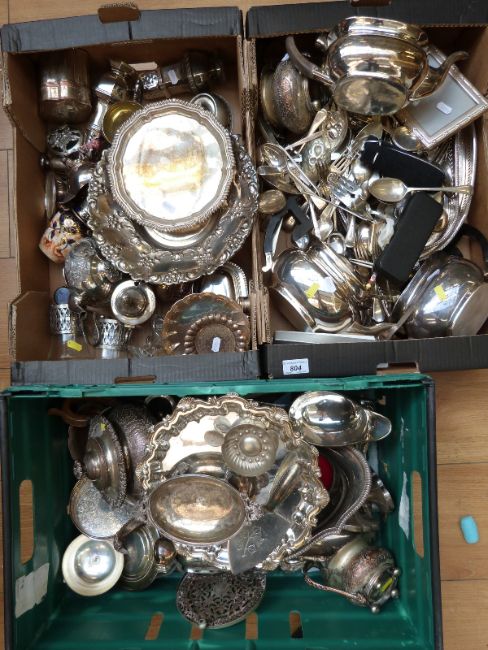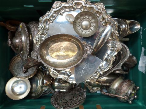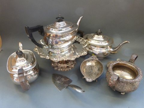 A large quantity of silver plate and other metalware including teaware, trays, tazzas, Keswick School cake slice etc