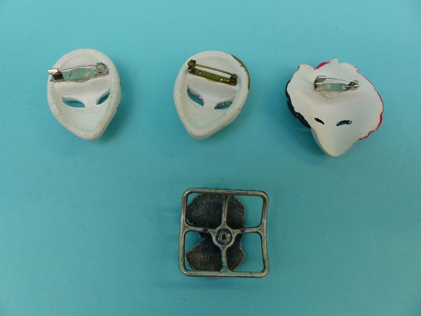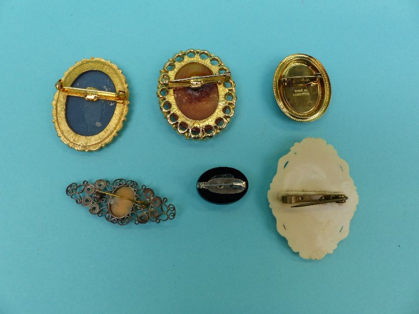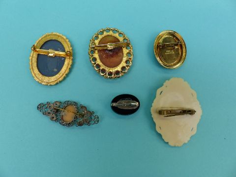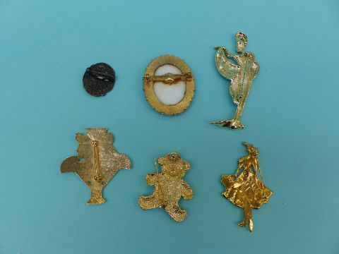 A collection of brooches to include cameos, novelty, Italian masks, enamelled jack-in-the-box, articulated clown, ladies, Winnie the pooh etc