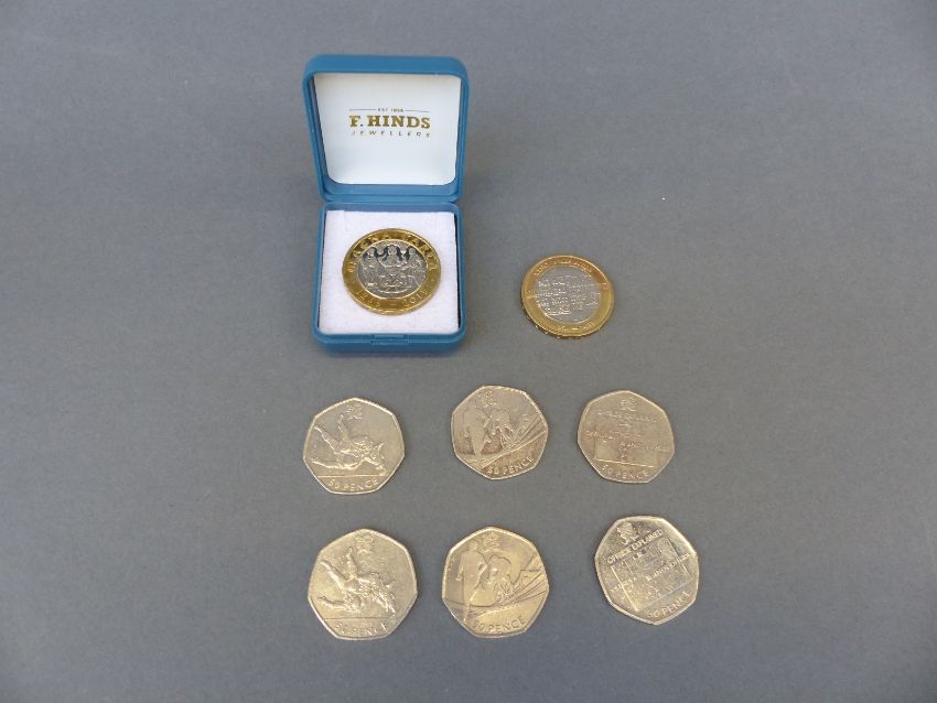 Six Olympic 2011 50 pence pieces including Judo and Triathlon, together with a near VF King James Bible £2 coin, and a 2015 Magna Carta example