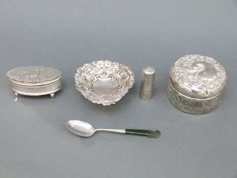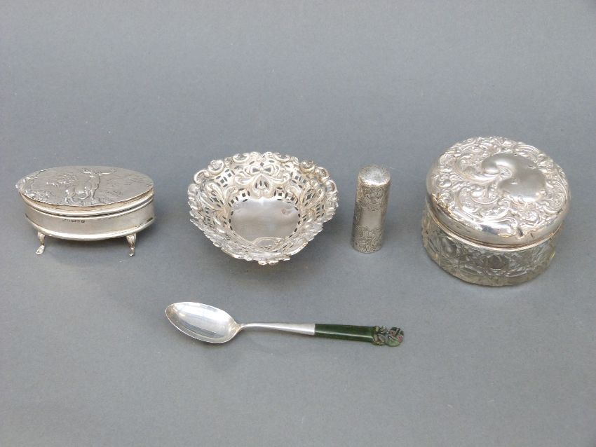 A George V hallmarked silver trinket box with stag to lid, Chester 1910, length 7cm, a hallmarked silver-lidded dressing table pot, hallmarked silver heart-shaped bon bon dish, weight 18g, silver scent bottle and a jade-handled spoon