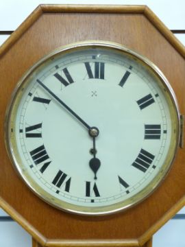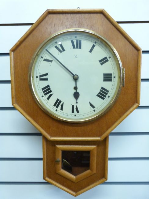 A light wood octagonal cased drop dial single train wall clock, by Ansonia clock company, the painted Roman dial with spade hands and brass bezel to dial glass