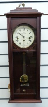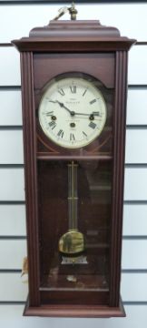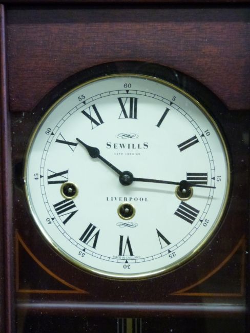 Sewills of Liverpool mahogany cased three train wall clock, the Westminster chimes with strike silent facility, the ivory coloured painted dial with Roman numerals and black spade hands, a small metal house featured inside the case, pendulum visible through glass door with reeded sides