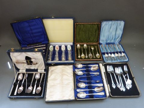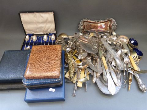 A quantity of cased and loose plated and hallmarked silver-handled cutlery, salts, scissors, snuffer, silver mounted glass etc